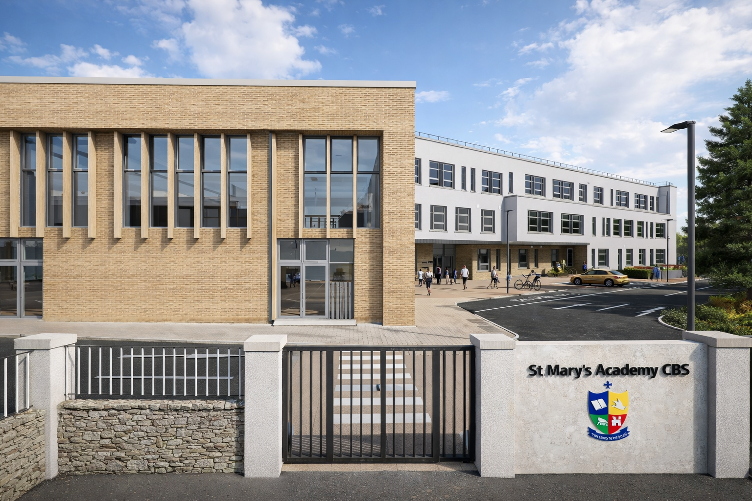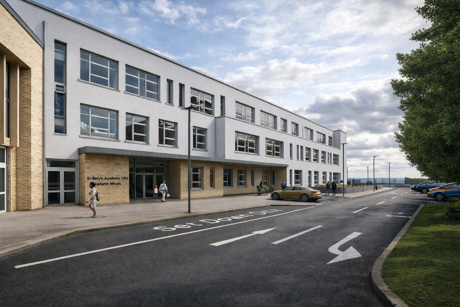 St Mary’s Academy CBS has been developed under the Department of Education ADAPT 2 Programme; our approach is guided by clarity, contextual response and long-term adaptability. The new three-storey building is conceived as a compact, legible form that consolidates accommodation on a constrained urban site while creating strong external edges and defined courtyard and play spaces. The massing responds to the surrounding residential context through controlled height, articulated façades and carefully selected materials, balancing civic presence with neighbourly scale. A clear internal planning diagram places general teaching, specialist rooms and SEN facilities along intuitive circulation spines, maximising passive supervision and wayfinding. Natural light and ventilation inform classroom orientation and façade design, supporting wellbeing and energy efficiency.